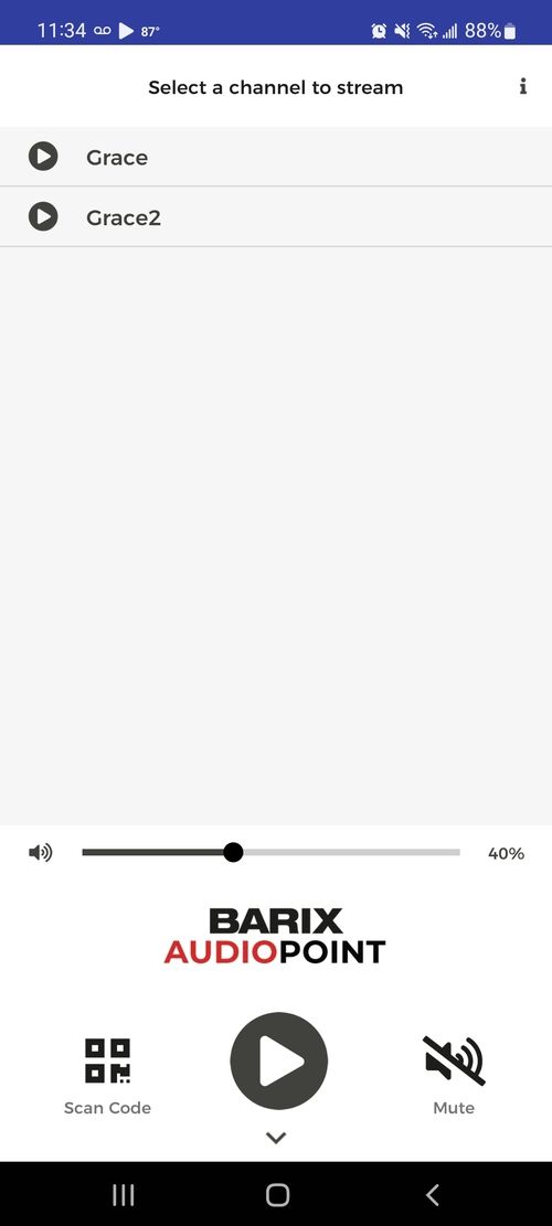 Pull up the AudioPoint app. You will see two stream options: Grace and Grace2. They are the same stream, so you can tap either one of them and then click on the play icon.