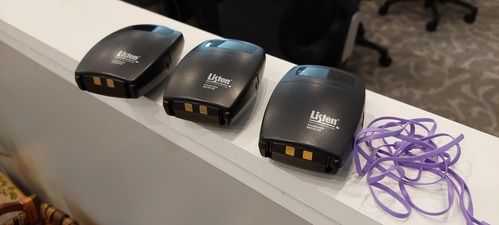 - You can use one of our three listening devices. These devices output sound from the in-house microphones. These devices require wired headphones or ear buds.