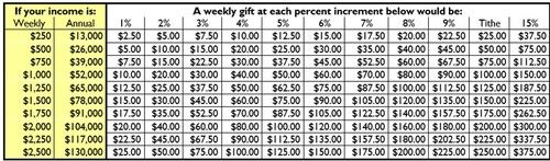 The amount of each member’s stewardship pledge is a personal, spiritual decision. The biblical concept of tithing (contributing 10% of one’s income to the church and other worthy organizations) is a standard to prayerfully consider. Some members may be able to equal or exceed the tithing level. Other members will pledge at a lower level. This giving percentage table is a guideline for those who would like to move toward this goal. All pledge contributions, regardless of the amount, are gratefully received as an expression of a member’s commitment.